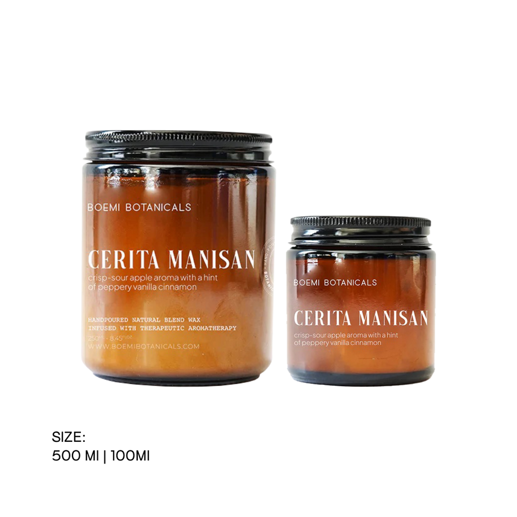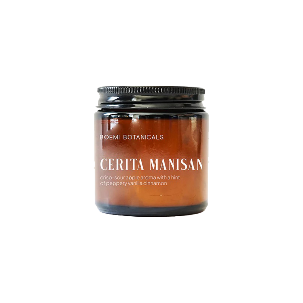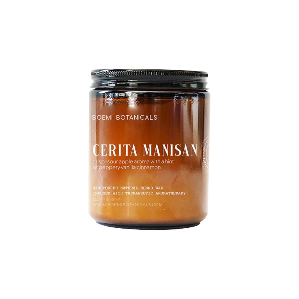 Bring a touch of playful sophistication into your space with BOEMI Botanicals Scented Candle Cerita Manisan, a natural candle crafted to elevate everyday moments through aroma. Made with natural palm wax and infused with 100% essential oils, this candle provides a clean and steady burn suitable for daily indoor use. The Cerita Manisan aroma features a crisp, slightly sour apple note layered with gentle hints of peppery vanilla and cinnamon, creating a distinctive aroma that feels fresh yet softly complex. Designed for home ambiance, this candle complements moments of relaxation, quiet reflection, or simple daily rituals.