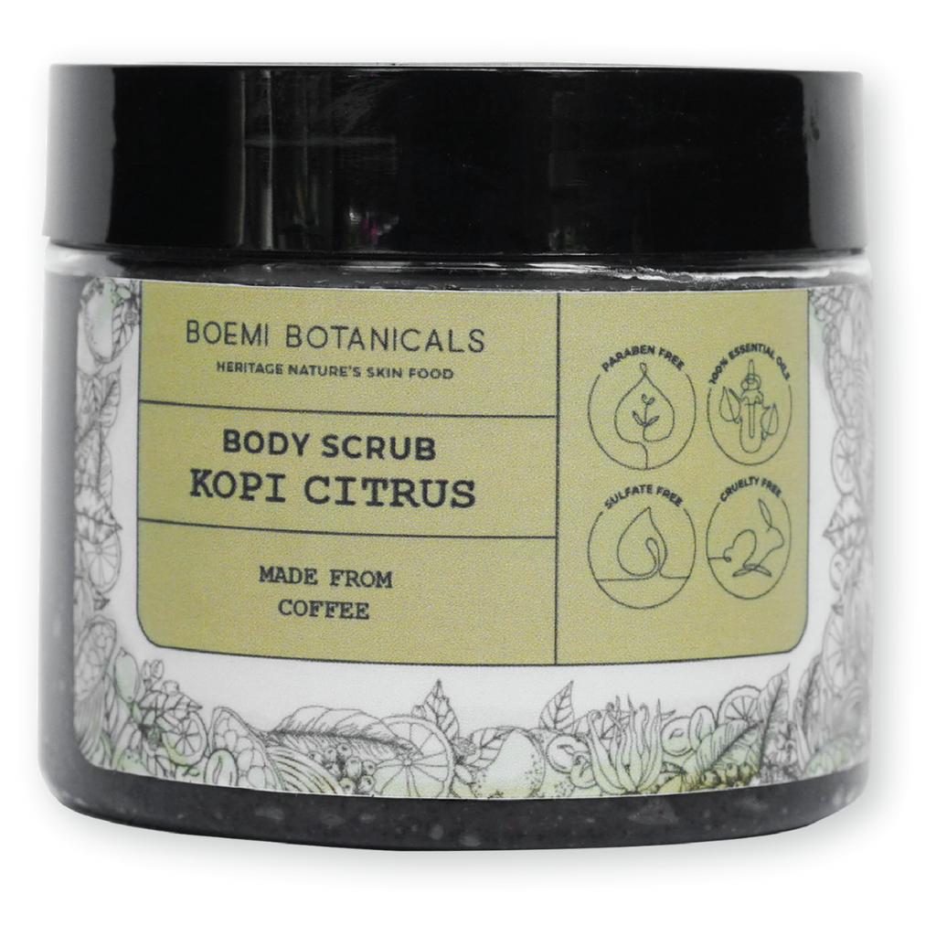 Refresh your skin with BOEMI Botanicals Natural Body Scrub Kopi Citrus, a creamy exfoliator inspired by the fresh and uplifting notes of Aroma Senja. Formulated with natural oils, honey, and coffee extract, this scrub helps smooth and refine the skin’s texture while leaving it hydrated with a soft, natural aroma. A blend of citrus and earthy essential oils — including bergamot, nutmeg, orange, and patchouli- creates a balanced aroma that enhances your body care routine. With regular use, it helps improve the look and feel of the skin, leaving it smoother and more supple.